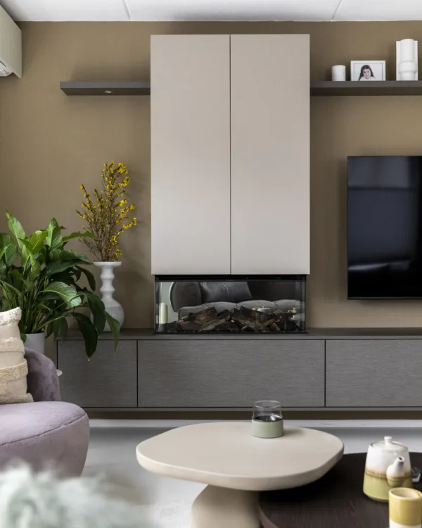 Si vous optez pour un meuble TV flottant avec des portes sans poignées ni chichis, vous obtiendrez un meuble silencieux. La cheminée électrique encastrée apporte confort et ambiance et constitue un complément unique au meuble TV fonctionnel.