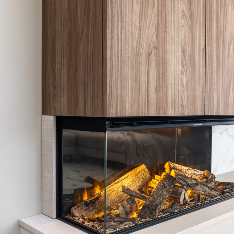 La question de l'emplacement de votre feu disparaît, car vous intégrez simplement un feu électrique encastrable dans votre armoire sur mesure. Vous choisissez vous-même l'emplacement idéal : pas besoin de conduit, de tuyaux ou de cheminée. Une simple prise de courant suffit. Rien de plus simple !