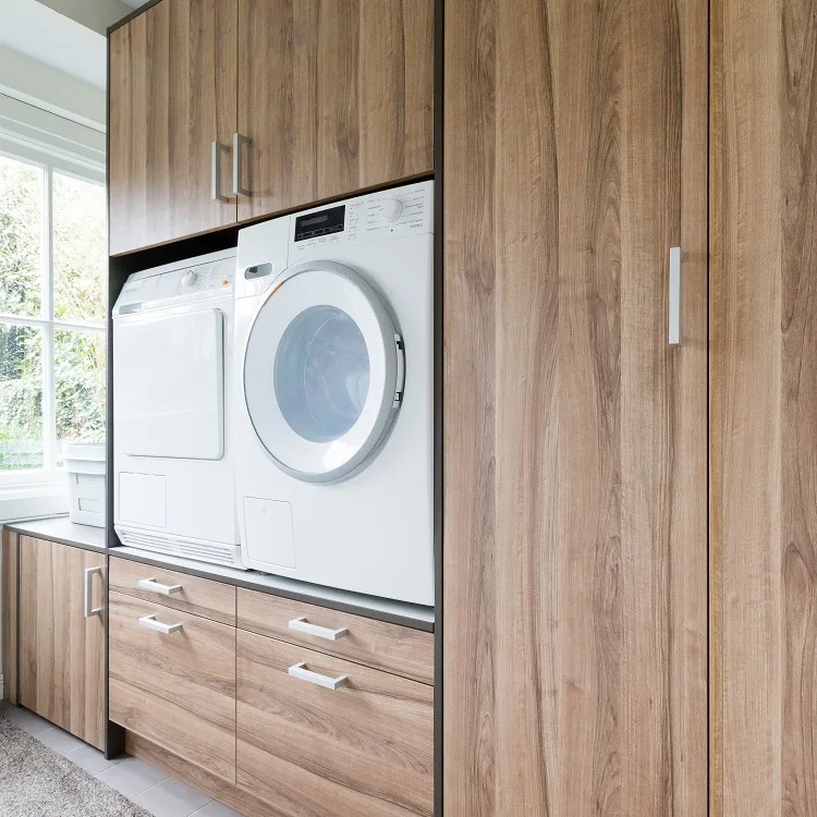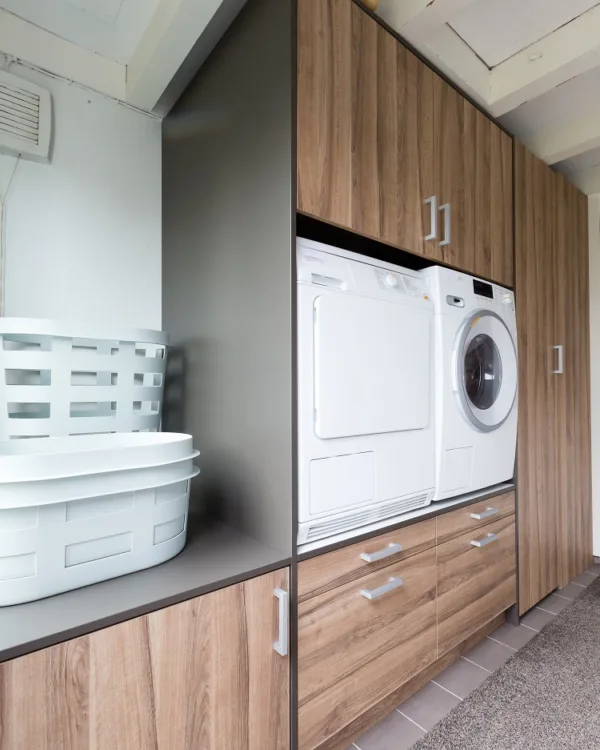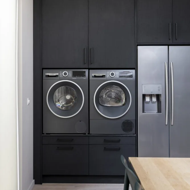 La taille de votre meuble pour machine à laver dépend des dimensions de votre machine à laver et de votre sèche-linge. Mesurez la largeur, la hauteur et la profondeur de vos appareils et venez dans l'un de nos magasins. Nous serons heureux de vous aider à concevoir un meuble sur mesure qui s'adapte parfaitement, avec un espace de rangement supplémentaire pour les produits de lessive, la planche à repasser et autres accessoires.
