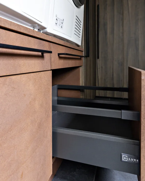 Votre meuble est entièrement fait sur mesure, afin qu'il s'intègre parfaitement dans l'espace que vous avez prévu à cet effet. Nous serons heureux de vous aider à organiser de manière optimale votre meuble pour machine à laver. Venez dans l'un des magasins et voyez ce que nous pouvons faire pour vous.