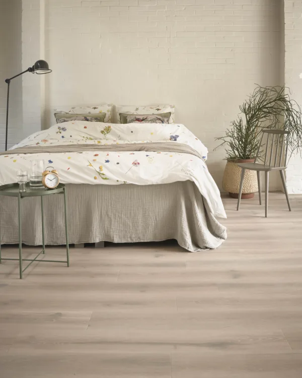 En plus d'être très solide, résistant aux rayures et aux taches, le clickvinyl est également très résistant à l'eau. Il convient donc parfaitement aux pièces humides telles que la cuisine ou la salle de bains. Autour d'un évier ou d'un lave-vaisselle où il y a des éclaboussures d'eau ou des chutes occasionnelles, le vinyle à cliquer convient parfaitement. Nous tenons à souligner que le vinyle à cliquer donne le meilleur de lui-même dans la salle de bains lorsqu'il y a un bac à douche. Nous ne recommandons pas la pose de vinyle à cliquer dans la zone de la douche.